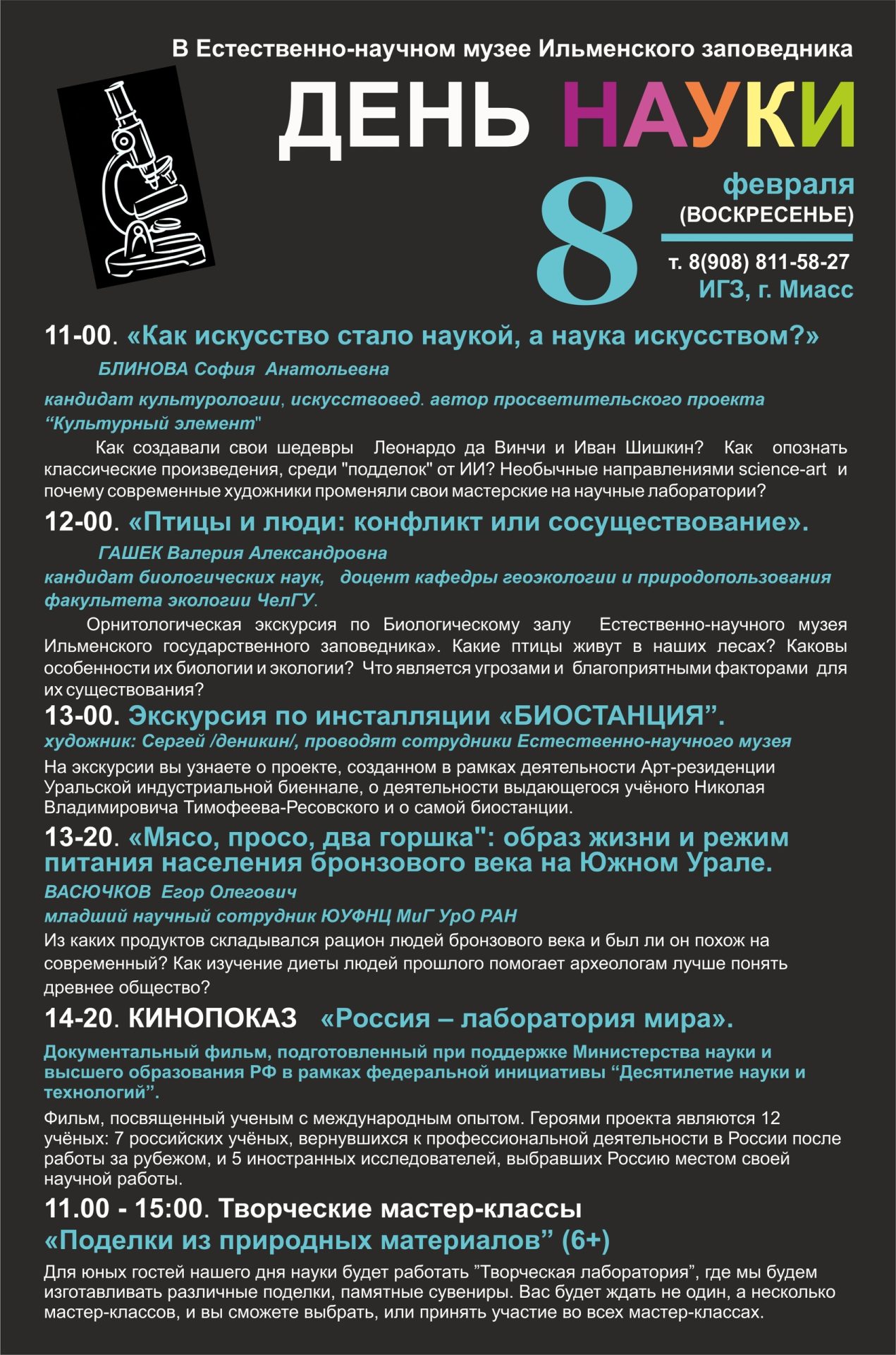 День Науки в России отмечается ежегодно 8 февраля. В Музее Ильменского заповедника в воскресенье для наших любознательных посетителей будет работать лекторий. С расписанием работы лектория вы можете ознакомиться ниже.